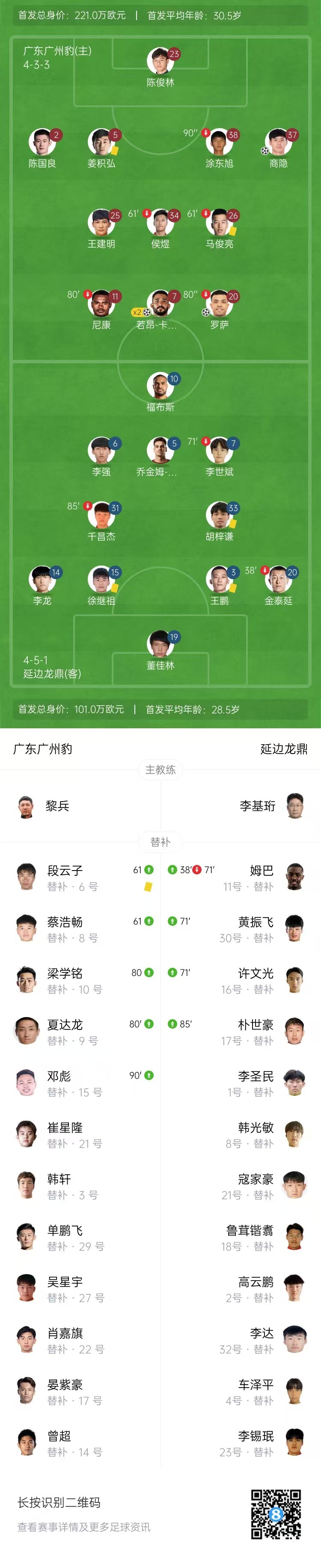 第26分钟,防守球员解围失误,商隐禁区左侧得球一脚抽射洞穿球门,广东广州豹1-0延边龙鼎。↓