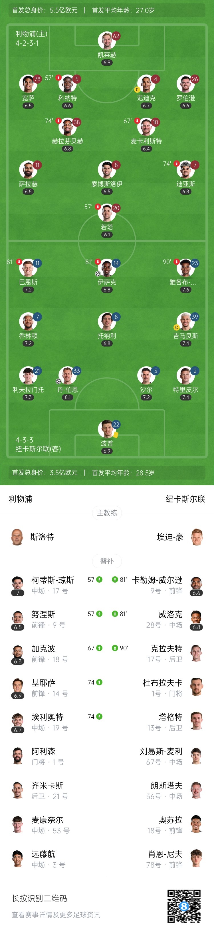 第69分钟,努涅斯斜传,加克波没有停好,墨菲断球后尝试一脚低射,这球偏出立柱。↓