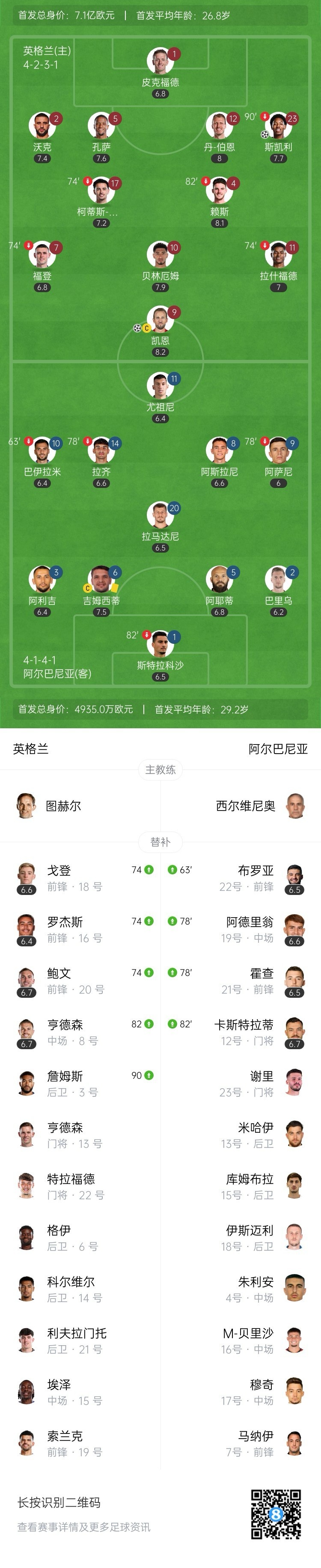 全场比赛结束,英格兰主场2-0战胜阿尔巴尼亚。