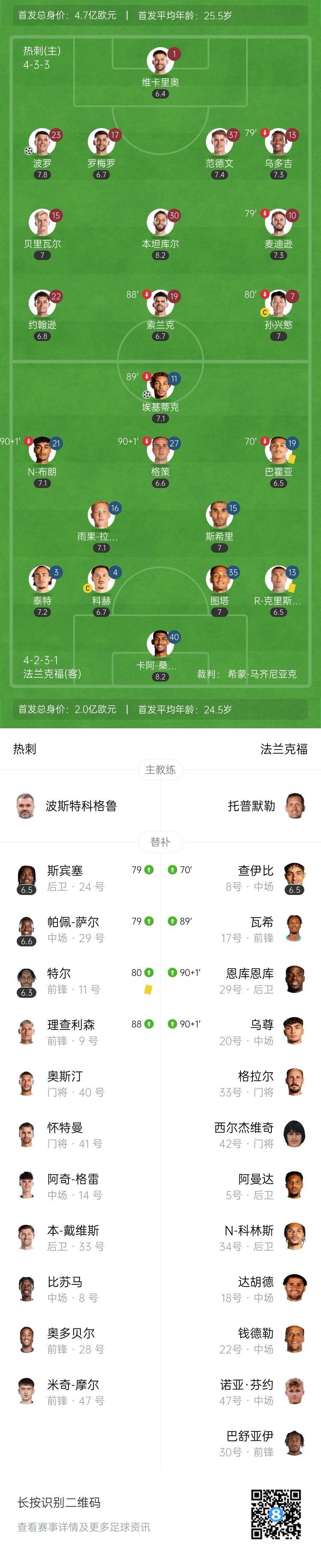 全场比赛结束,热刺1-1法兰克福。