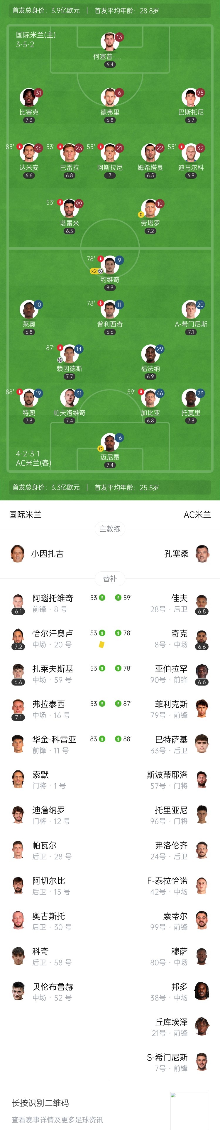 第49分钟,AC米兰右侧角球,特奥开进禁区,皮球经过折射来到约维奇面前,约维奇近距离抽射破门!本场比赛完成双响!AC米兰2-0,总比分3-1领先国米↓