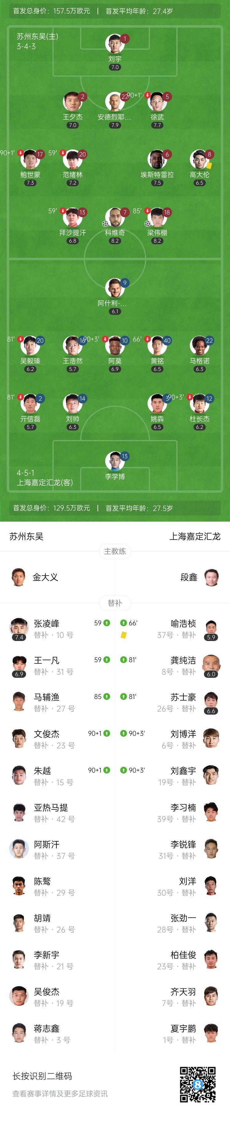 苏州领先!科维奇连场破门+赛季第3球!第55分钟,范绪林主罚角球开出,科维奇后点抢点头球破门,苏州东吴1-0上海嘉定汇龙!↓