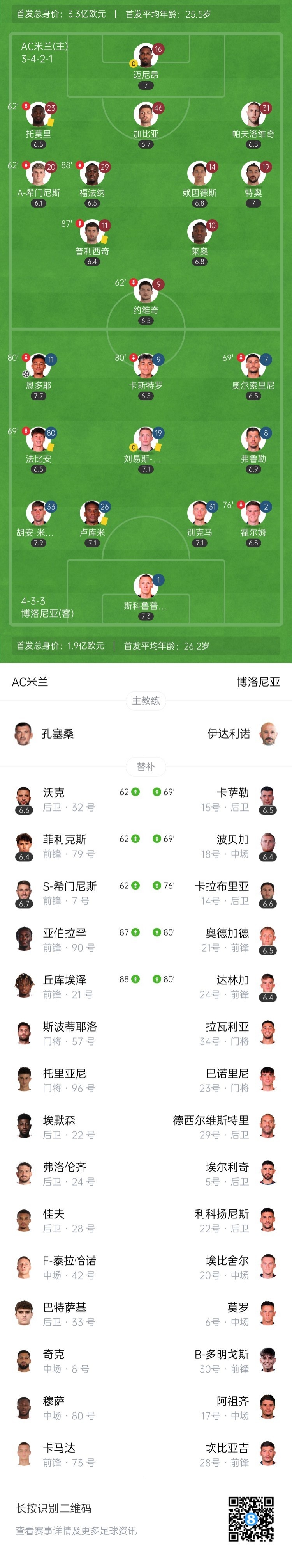 全场比赛结束,最终AC米兰0-1博洛尼亚。