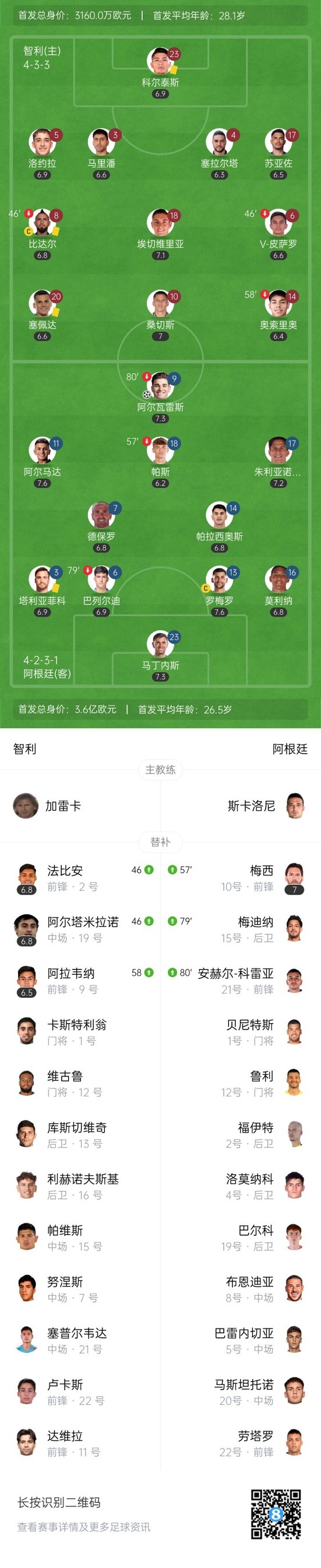 第15分钟,阿根廷首开记录!反击机会阿尔马达左路直塞球给到阿尔瓦雷斯单刀机会挑射破门,智利0-1阿根廷。↓