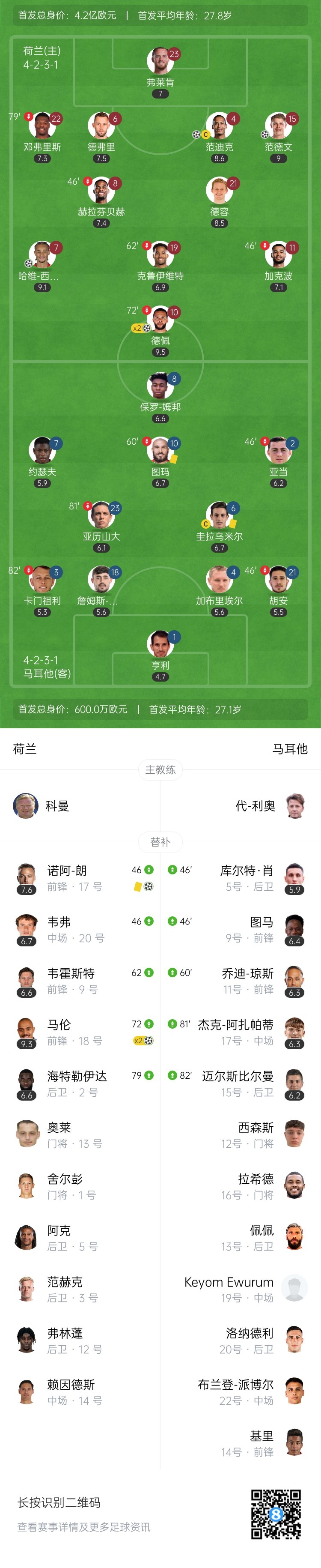 第20分钟,荷兰中路短传渗透,德容做球,范迪克弧顶位置迎着防守远射爆杆破门,荷兰3-0领先↓