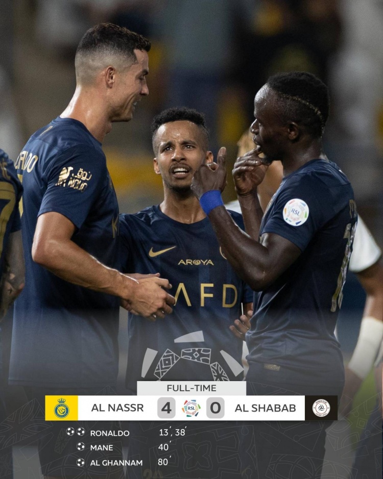 第40分钟,布罗佐维奇横传,C罗斜塞到禁区右侧,马内小角度铲射得手,利雅得胜利3-0利雅得青年人!↓
