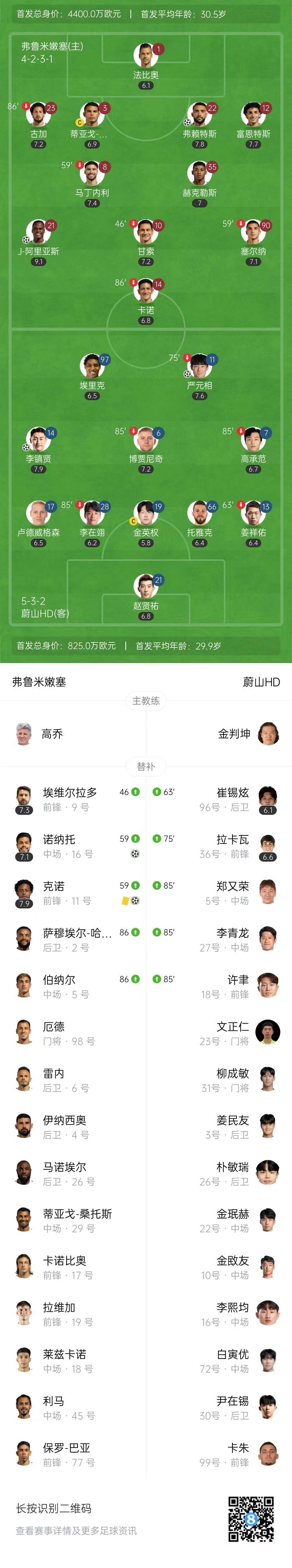 第66分钟,克诺左侧得球晃动后传中,防守球员解围不远,诺纳托得球推射将球打入死角,弗鲁米嫩塞扳平比分,2-2!↓
