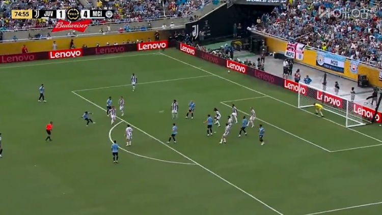萨维尼奥世界波+传射!第76分钟,曼城的角球机会,哈兰德乱战中打门被迪格雷戈里奥挡出,萨维尼奥外围兜射直挂死角,尤文图斯1-5曼城!↓